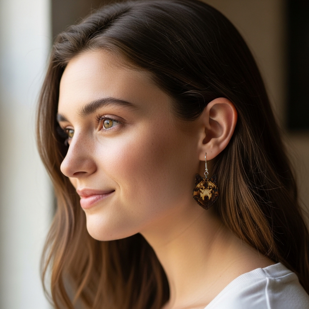 Delikatne, dwustronne kolczyki grawerowane laserowo z moich ilustracji lub wykonane z przesłanych grafik. Ze względu na niewielkie rozmiary (zwykle ok. 2,5–3 cm) wzory są uproszczone, ale zachowują charakter i estetykę. Lakierowane w celu zwiększenia trwałości.